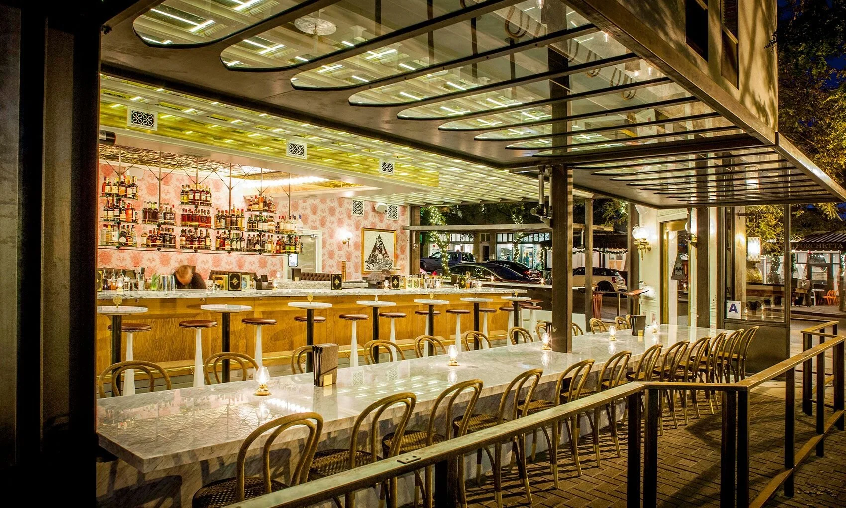 French Gothic details meet heavy metal influences, all executed with modern tools to implement the timeless look of craftsmanship. Nearly every feature was custom-made for Kindred, including an LED back-lit mirrored coffered ceiling, custom tête-à-tête oak seating installation, 10-foot tall French Gothic inspired flip windows, an over-sized spirits chandelier, and a 900-pound black four-eyed wolf sculpture.